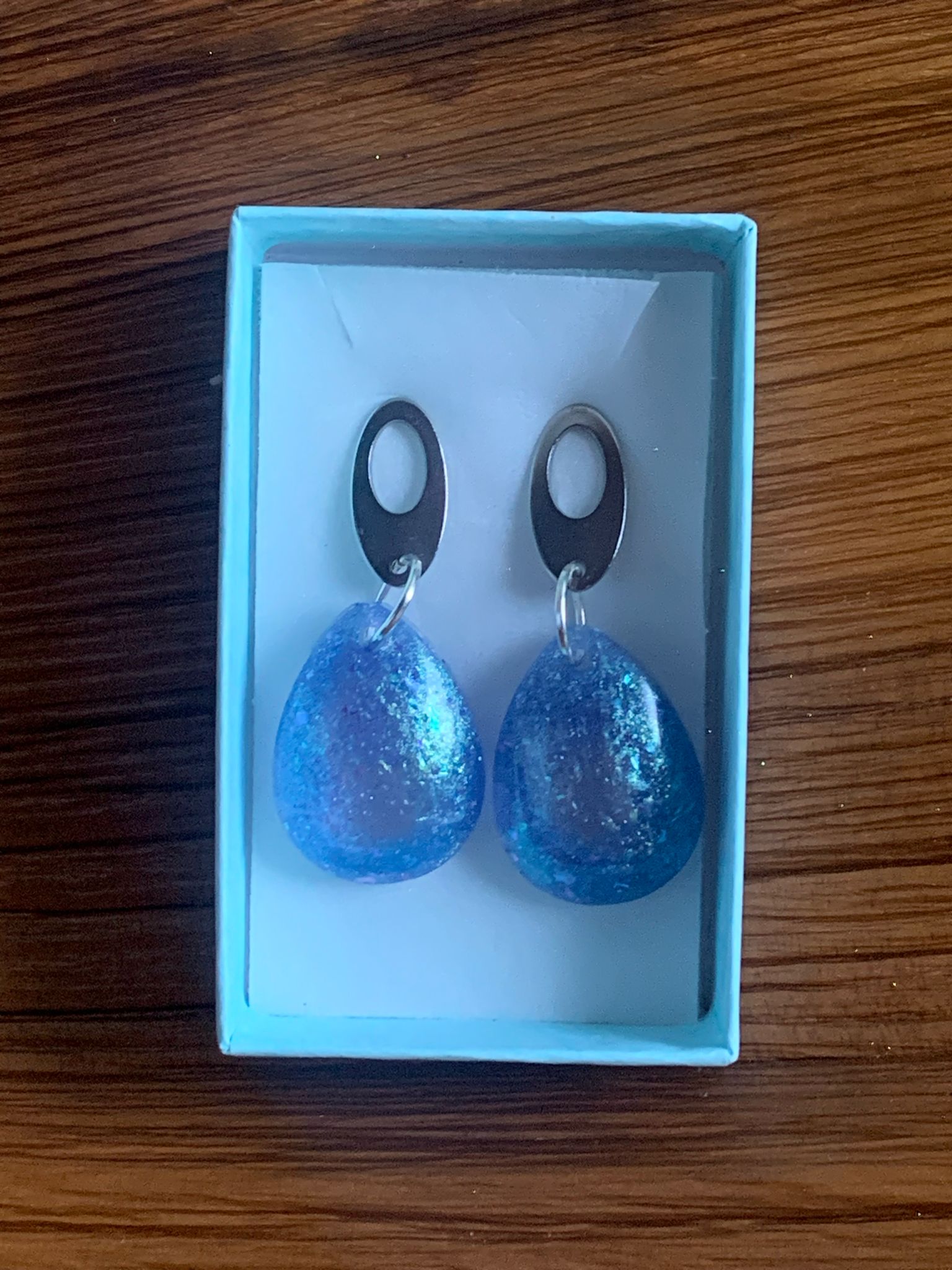Elevate your elegance with our exquisite silver and blue opal-looking resin dangling earrings. Handcrafted to perfection, these delicate beauties combine the allure of opals with the shimmering elegance of silver. Whether it’s a special occasion or everyday wear, these earrings add a touch of sophistication. Get yours today! 💙✨