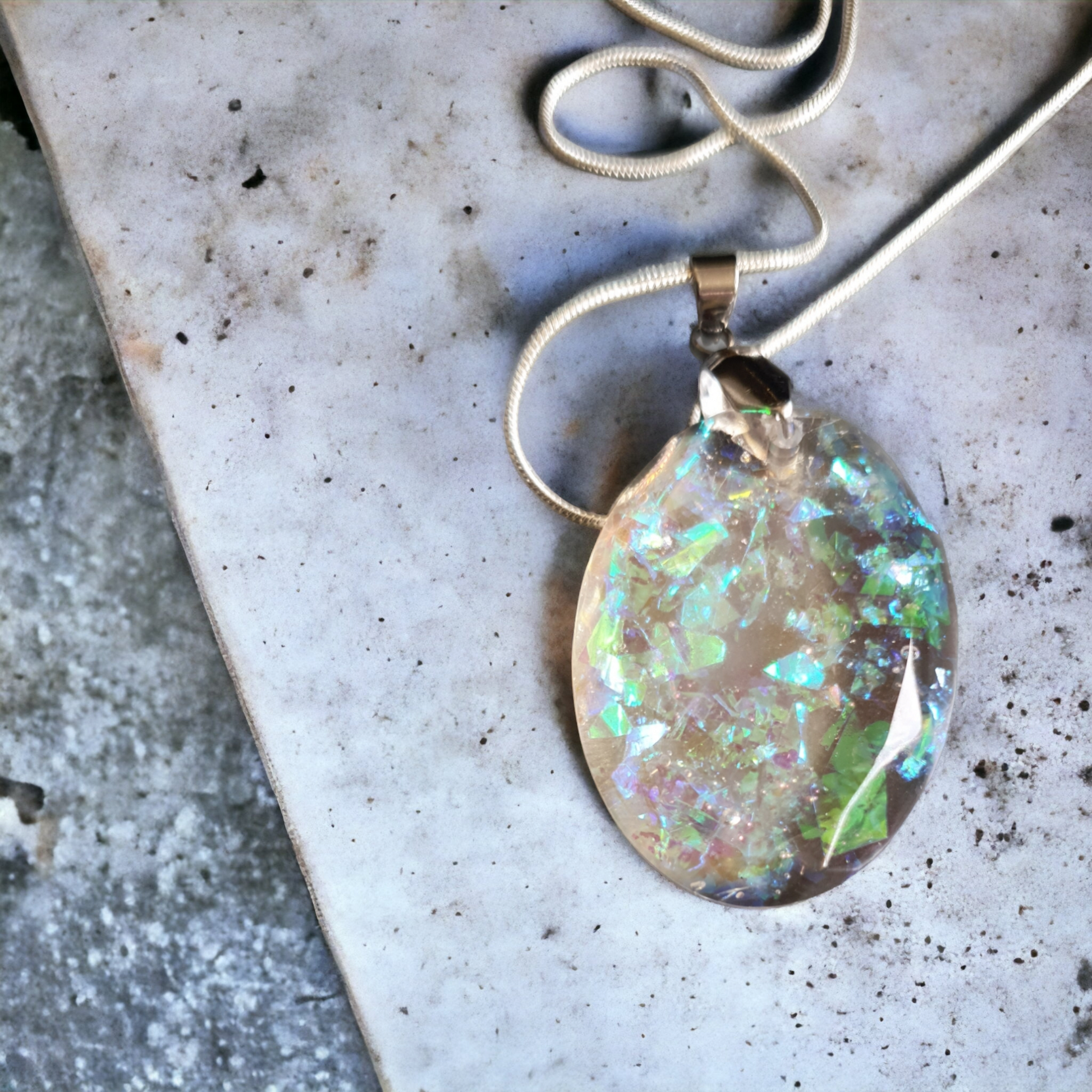 Perfect for layering with other necklaces or just wearing it by itself.  The simplicity of this pendant is great for wearing it by it self as well.  Unique and beautiful clear  looking Pendant with a silver snake chain. This  piece is  Unique  as  it is  individually made.  Add individual and unique elegance and beauty to women.