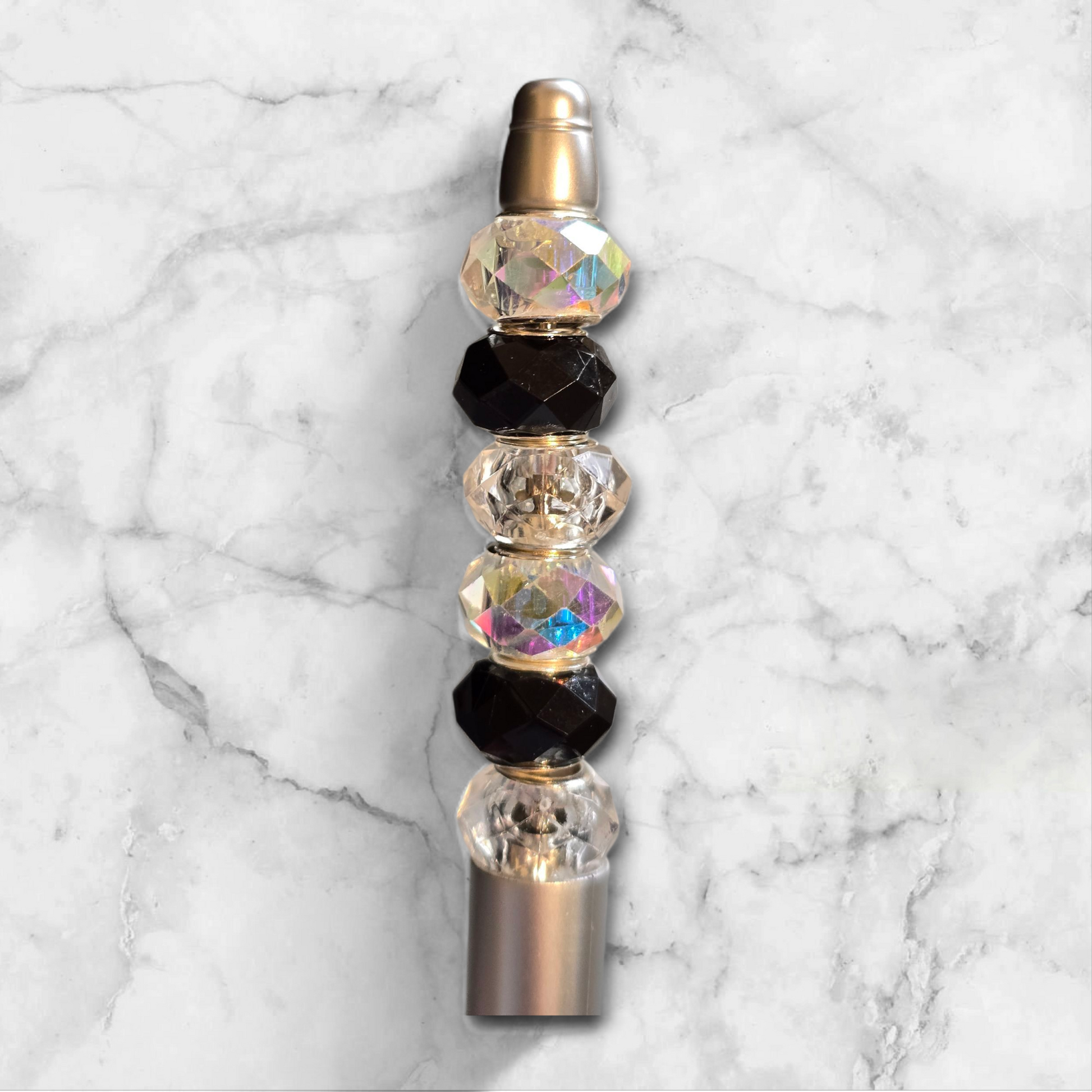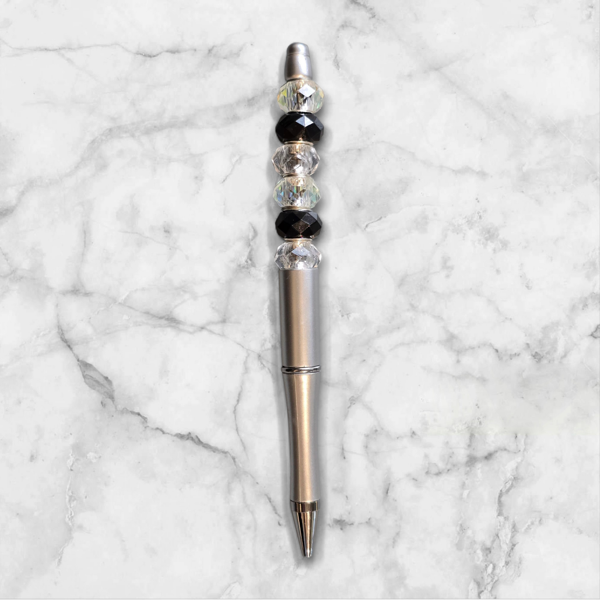 Expertly crafted with a sleek silver finish and adorned with delicate beads, our Beaded Silver Gel Pen offers a luxurious writing experience. With smooth black ink, this pen is perfect for any task, providing precision and elegance. Elevate your writing with our Beaded Silver Gel Pen.