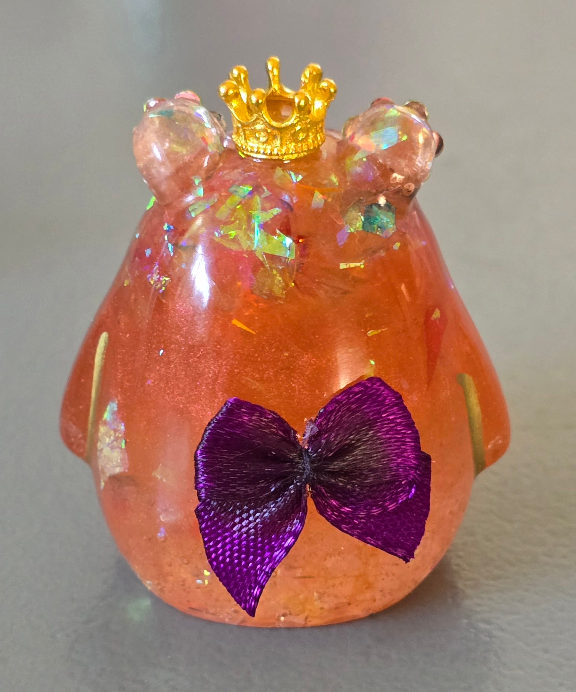 "Get crowned with cuteness with our Bear orange! This quirky and fun orange bear comes complete with a crown, purple bow , and sparkling rhinestones. Individually made for maximum uniqueness. (Orange you glad you found this adorable bear?)"
