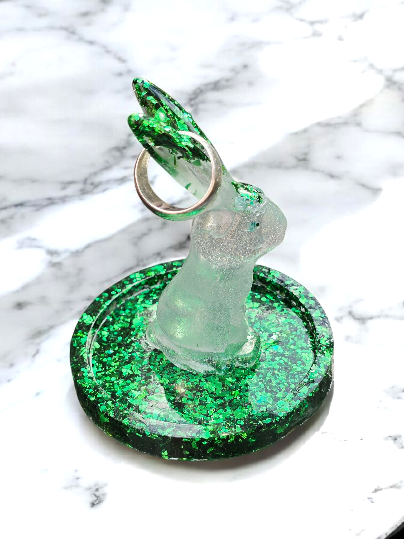 Add some whimsy to your jewelry storage with our Bunny ring holder! Made of green glitter plate, this adorable bunny will keep your rings safe and easily accessible. No more lost rings, just hop on over to your new favorite accessory!
