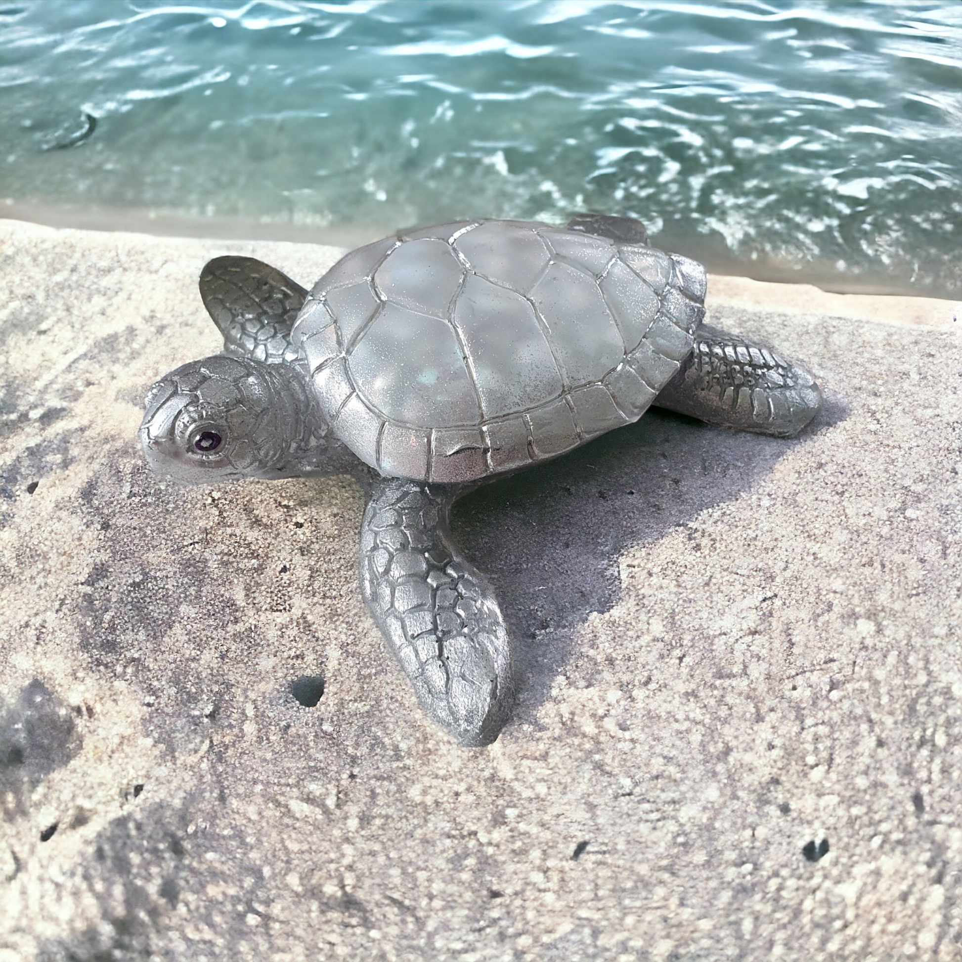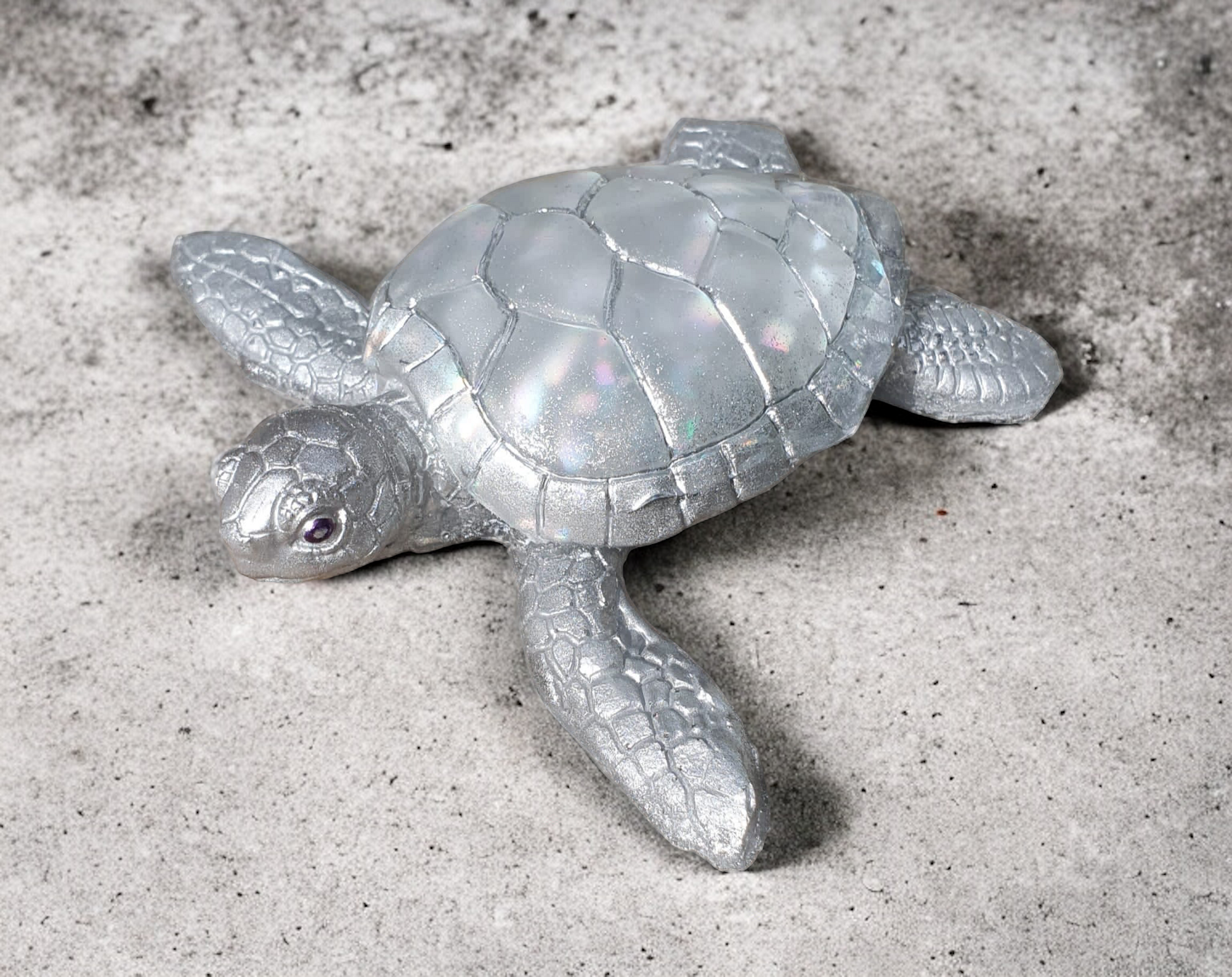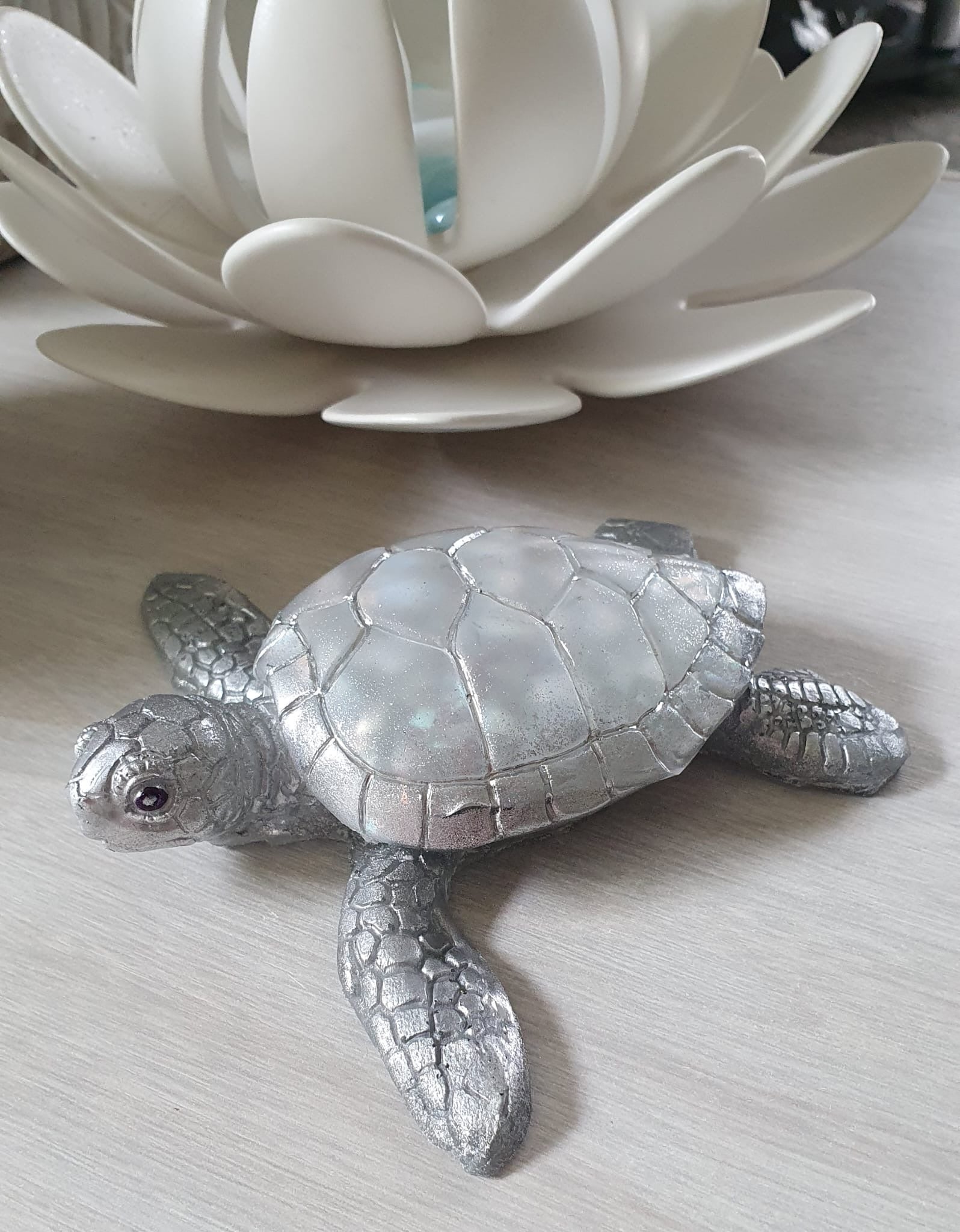 Dive into the world of enchantment with our Silver Resin Turtle at Charming Creations! Its shell reflects light like an illusion of diamonds, creating a mesmerizing display of elegance. Elevate your space with this gorgeous piece – a perfect blend of charm and craftsmanship. Get yours now and let the magic unfold!