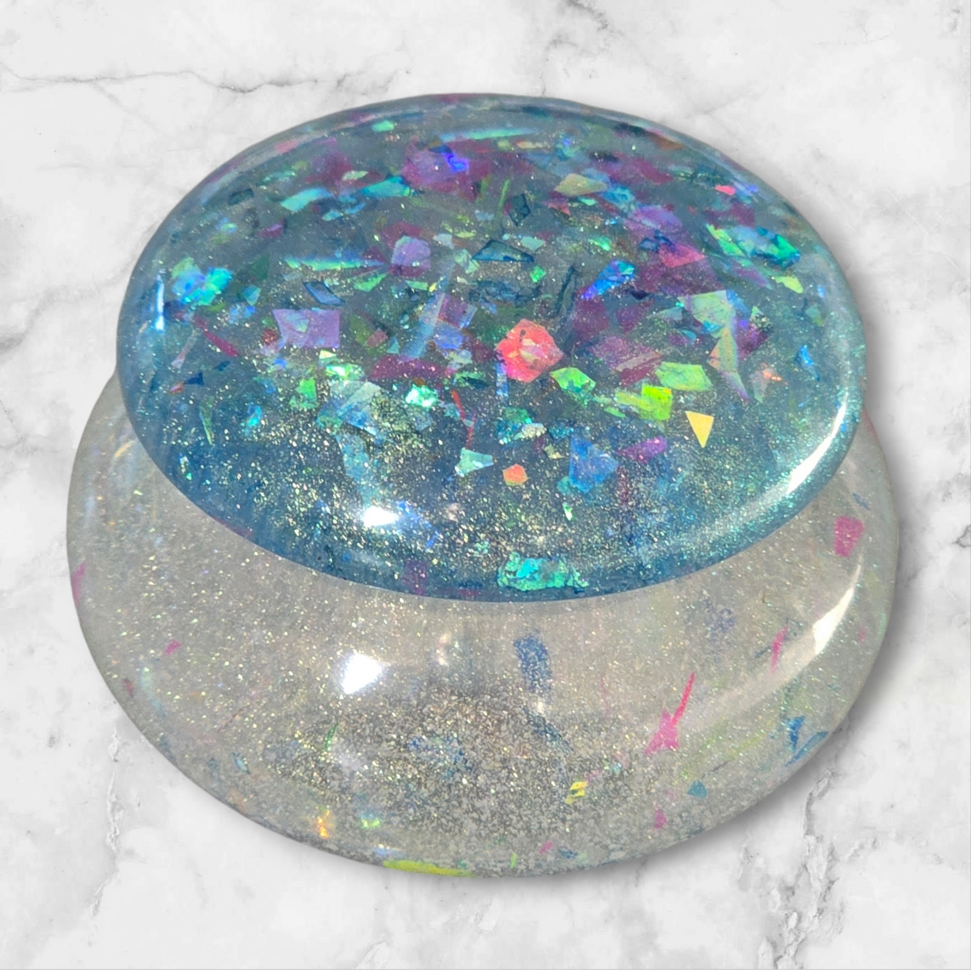 "Keep your trinkets safe and sparkly in this small resin jar, perfect for adding a pop of blue to your decor. A playful way to store your trinkets."