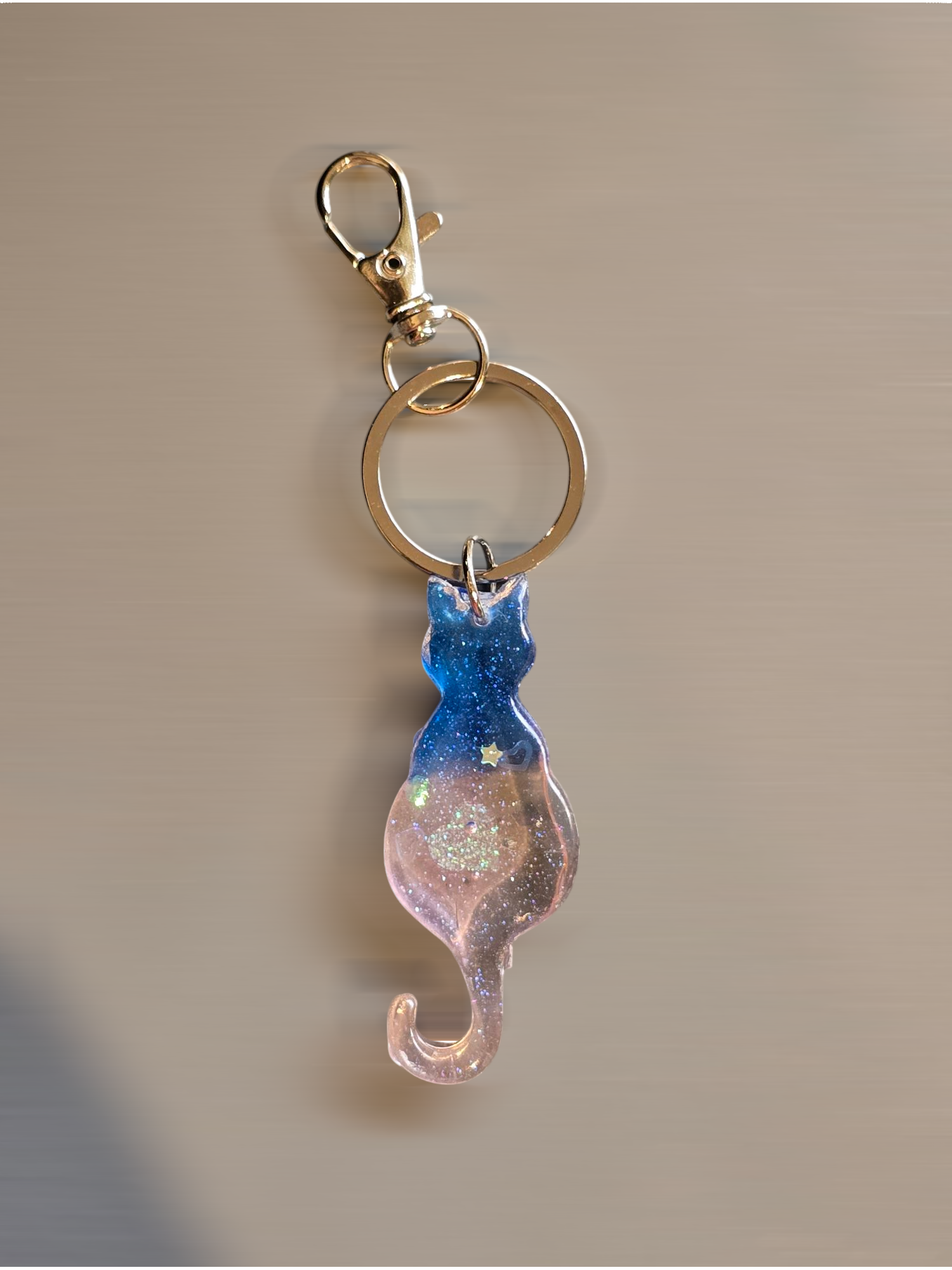 Meet your new feline friend, the Keycharm Cat! Made of pink and blue transparent resin, this playful kitty comes with a rose gold keyring. Keep your keys close and in style with this quirky accessory. No litter box required!