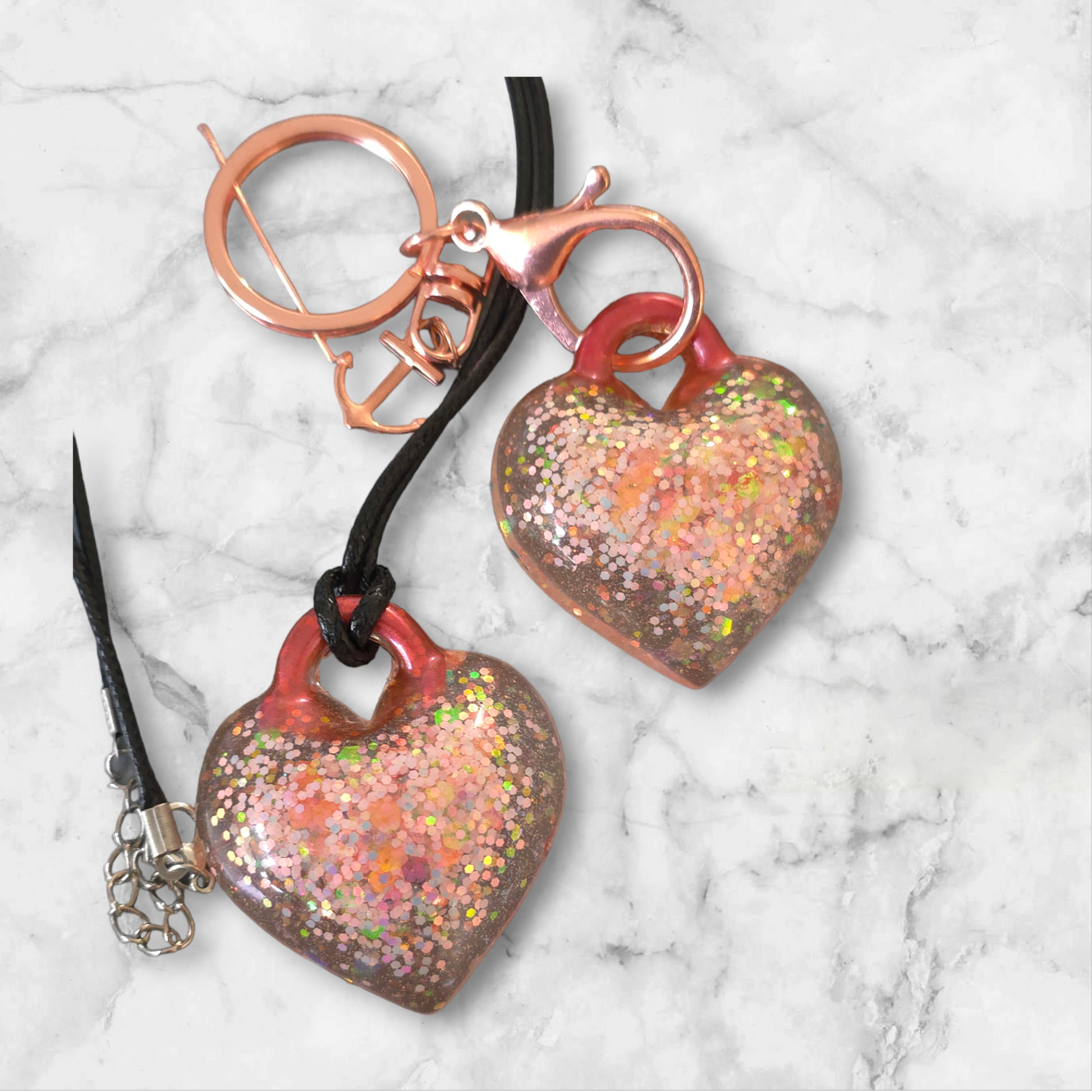 Enhance your style with our Keycharm puffy heart set in luxurious rose gold resin. The matching pendant adds an elegant touch to any outfit. Show off your fashion sense with this must-have accessory.