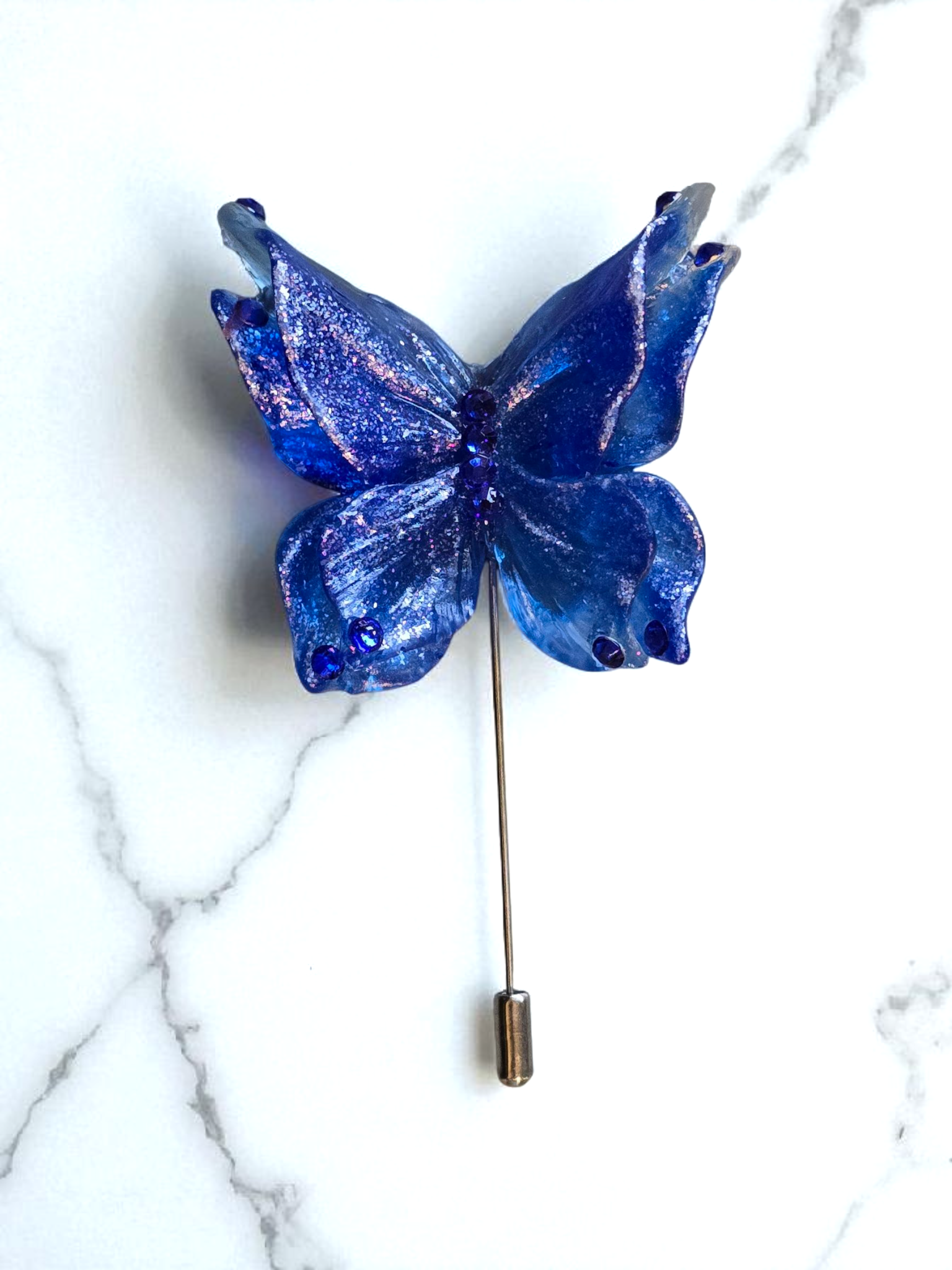 Elevate your outfit with our cobalt blue Lapel Pin! The elegant double butterfly wings, silver accents, and sparkling rhinestones will add a touch of sophistication to any look. Show your attention to detail and stand out with this charming accessory.