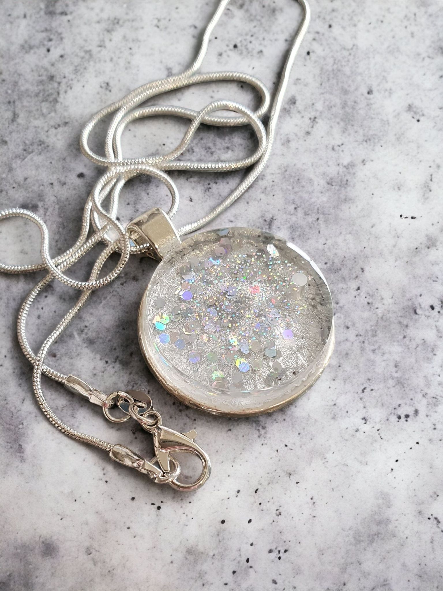 Introducing our Razzle Dazzle Pendant! Crafted with precision, this exquisite piece features a captivating blend of silver glitter. Elevate your style today!
