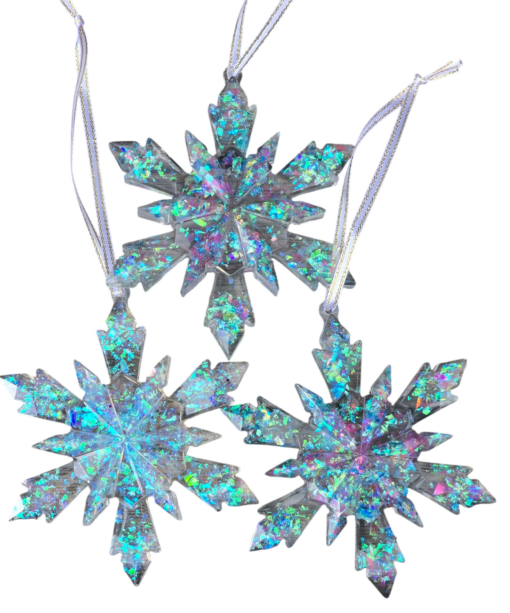 "Add a touch of whimsy to your Christmas tree with this set of 3 sparkling snowflakes in shades of blue, green, and pink. Perfect for a quirky holiday vibe!"
