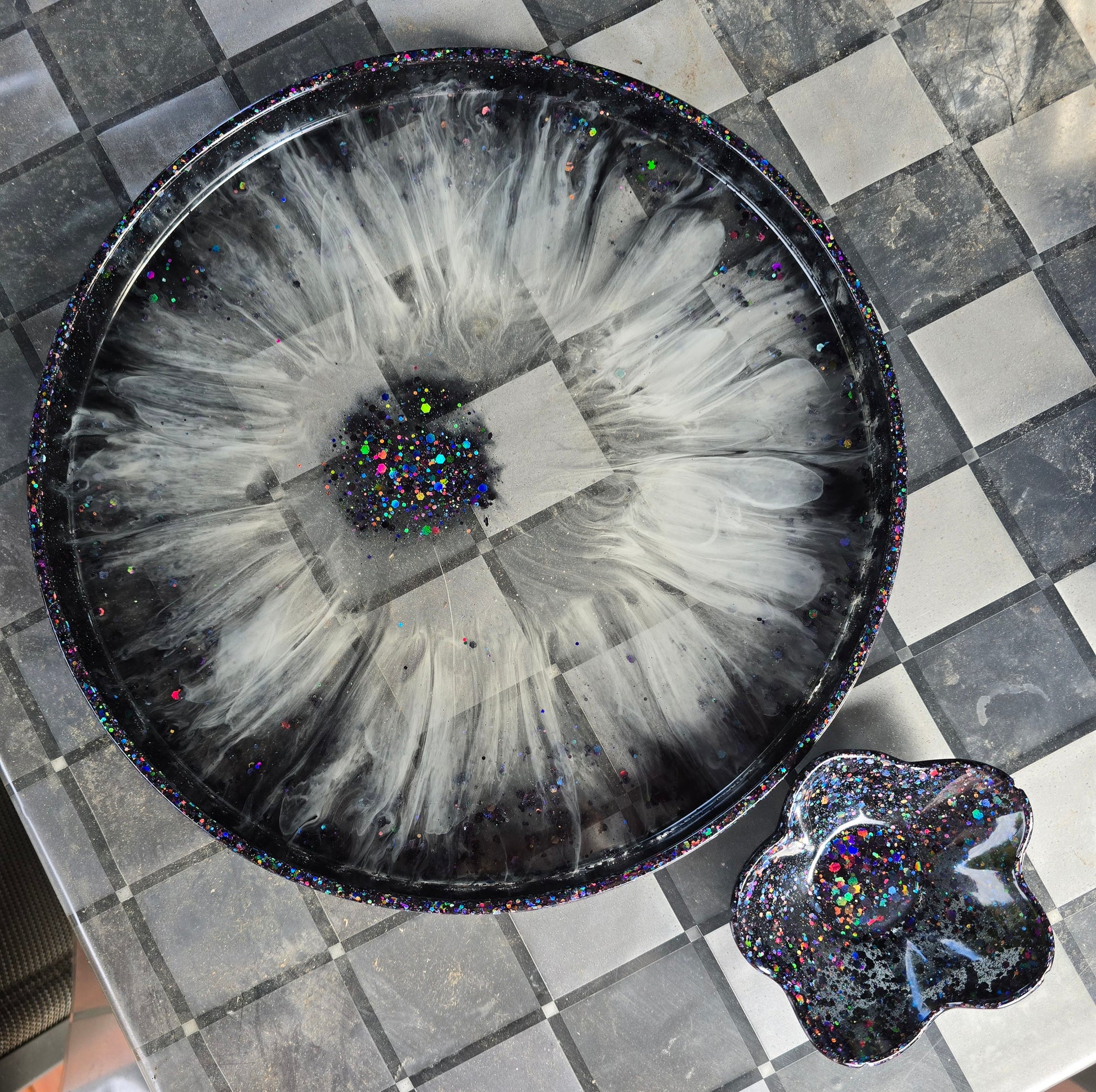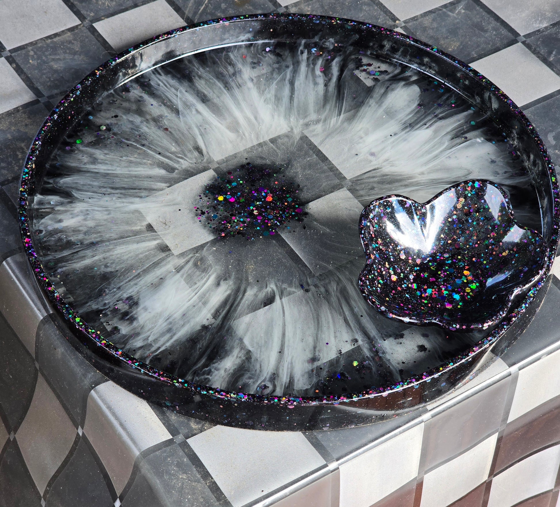 Introducing the Tray Black Sparkle - the perfect addition to any home or office space. Crafted with a sleek and stylish design, this tray adds a touch of elegance to any room. With its sturdy construction and versatile use, it's the ideal choice for serving drinks, organizing small items, or simply as a decorative piece. Upgrade your decor today with the Tray Black Sparkle. The small black petal bowl can also be paired with the black sparkle tray.