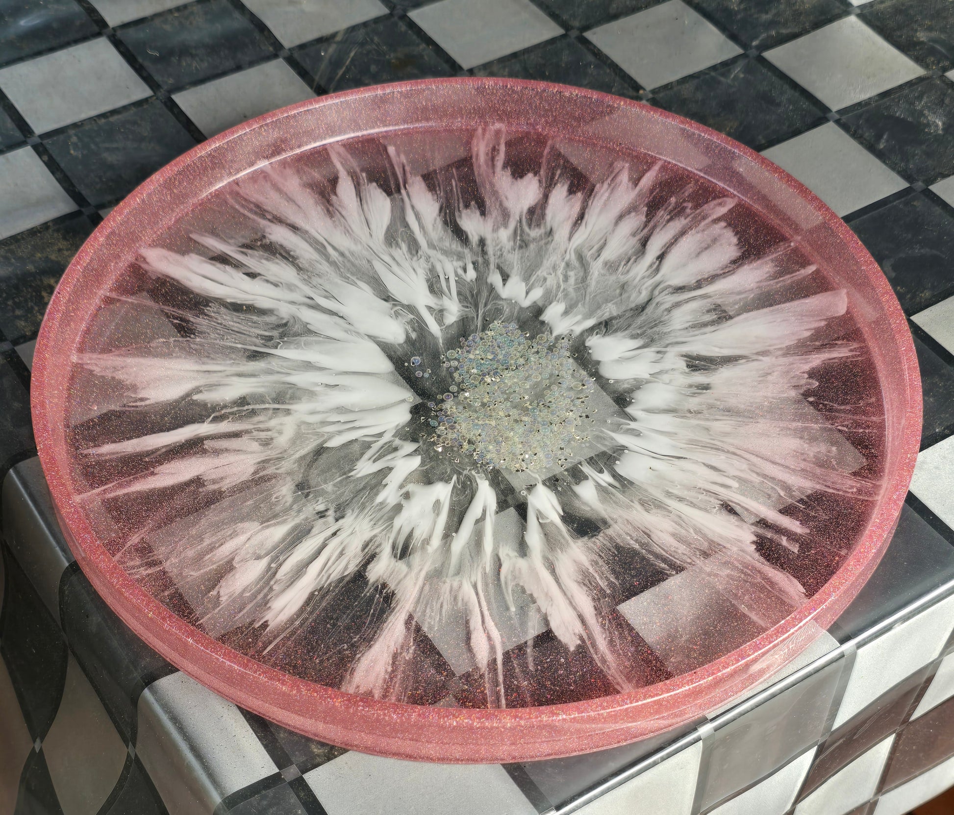 This pink and white tray is the perfect addition to any home decor. Its unique color combination adds a touch of elegance and style, while its functionality makes it great for serving snacks or organizing small items. Complete your home with this beautiful tray. This tray can also be used with the pink petal bowl that is sold separately. The petal bowl can be used for dips or snacks as well as trinkets