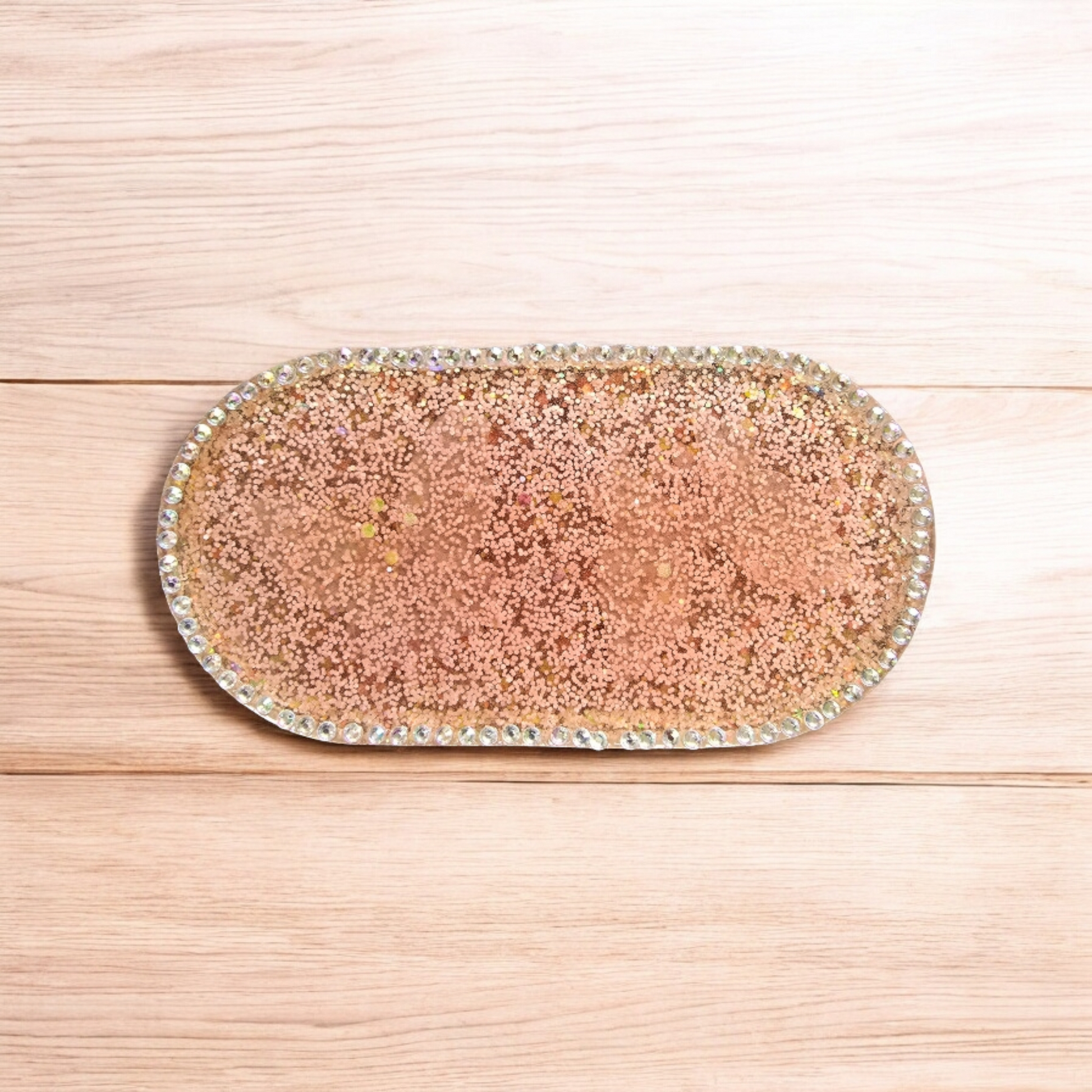 "Organize your trinkets in style with our small pink trinket tray. This playful tray features pink glitter and sparkling rhinestones, adding a touch of glamour to your space. Keep all your treasures in one place, and add a touch of quirkiness to your decor. (Note: Trinkets not included. Sorry, we don't have that kind of magic.)"